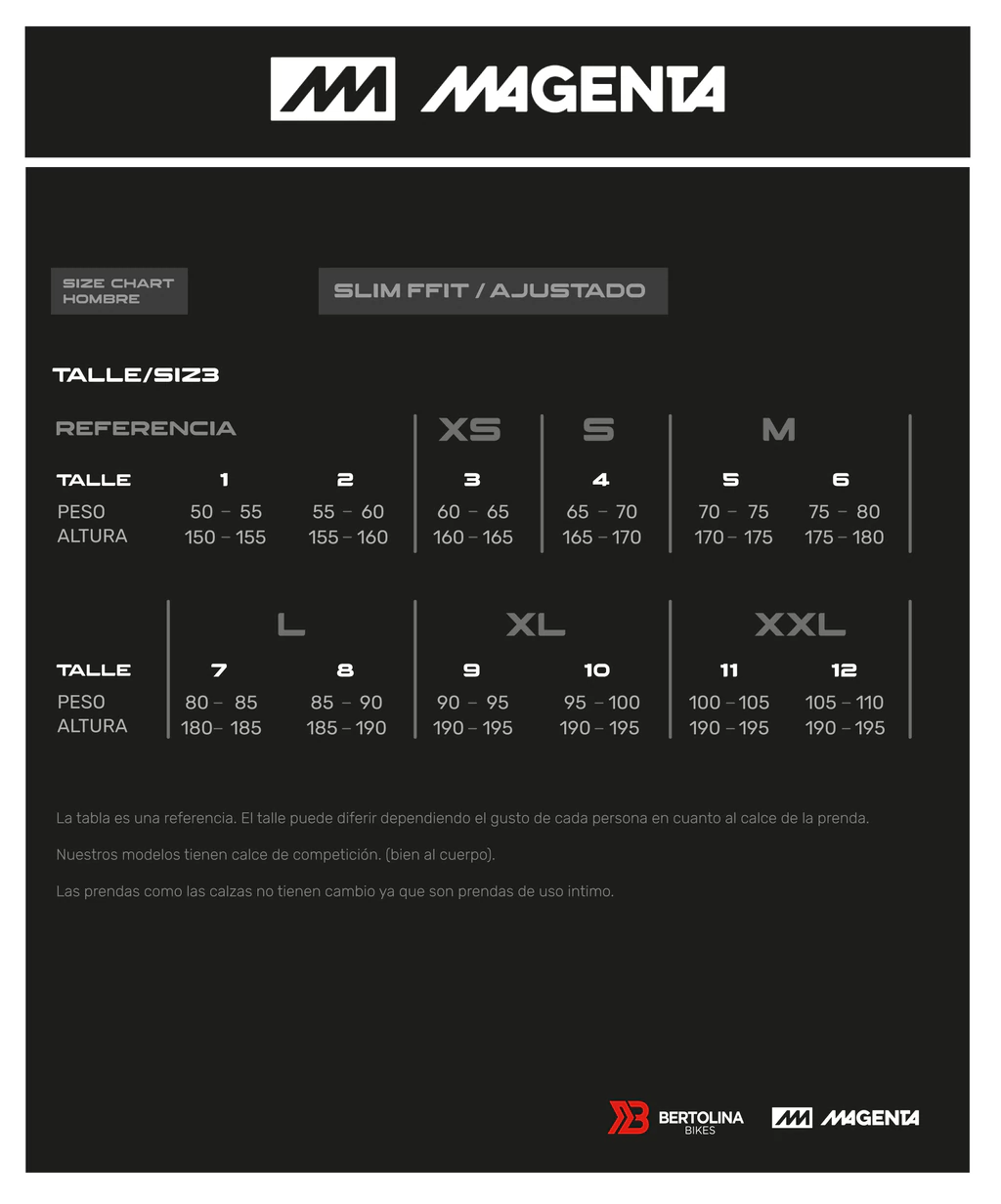 *El talle sugerido en la tabla de talles, corresponde a calce ajustado al cuerpo (Fit) como se utiliza en competición, se sugiere 1 o 2 talles más del representado en la tabla si le gusta la prenda más holgada o suelta.